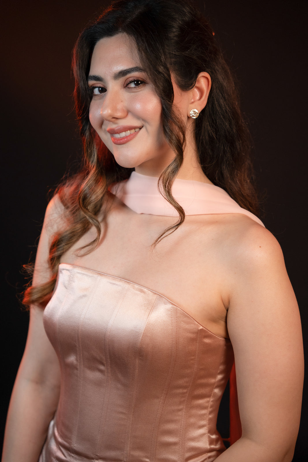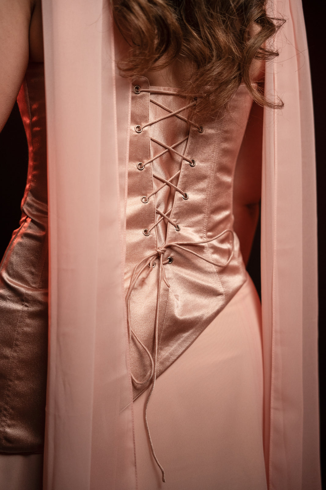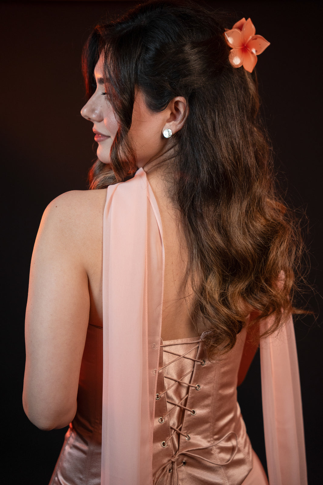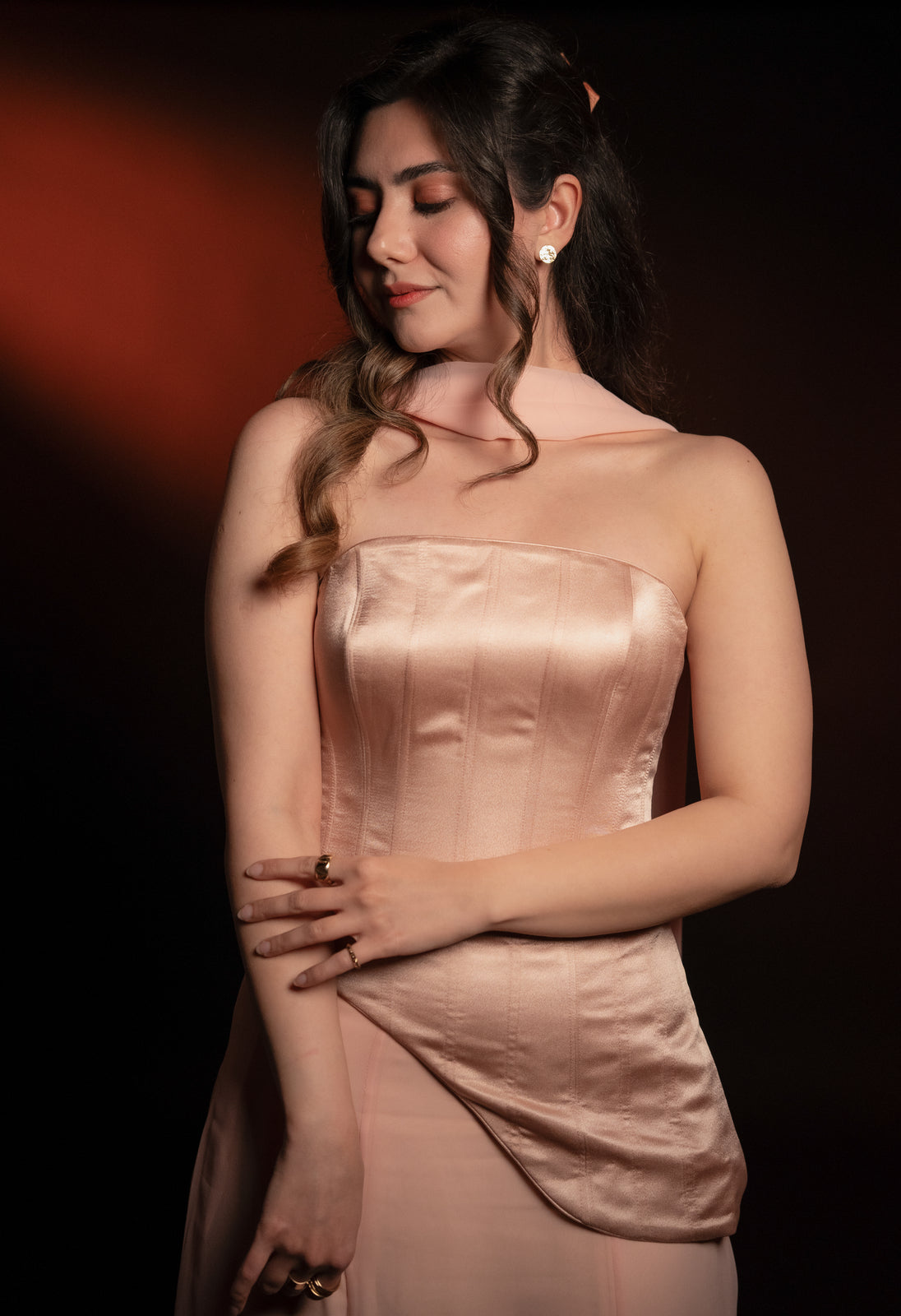 Sculpt your silhouette in this luxurious champagne satin corset dress. The structured bodice cinches your waist while the flowing maxi skirt creates an effortlessly elegant silhouette.