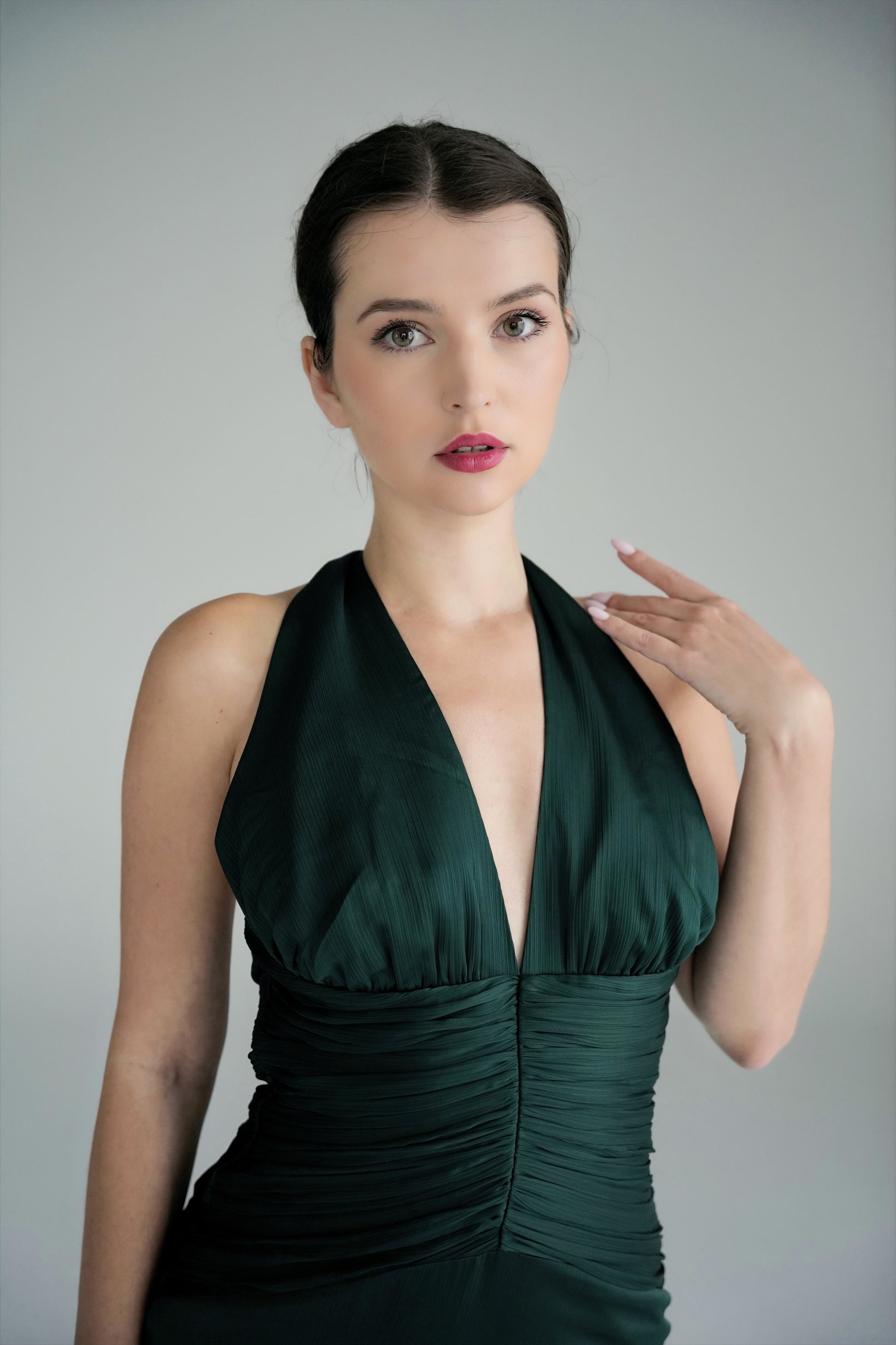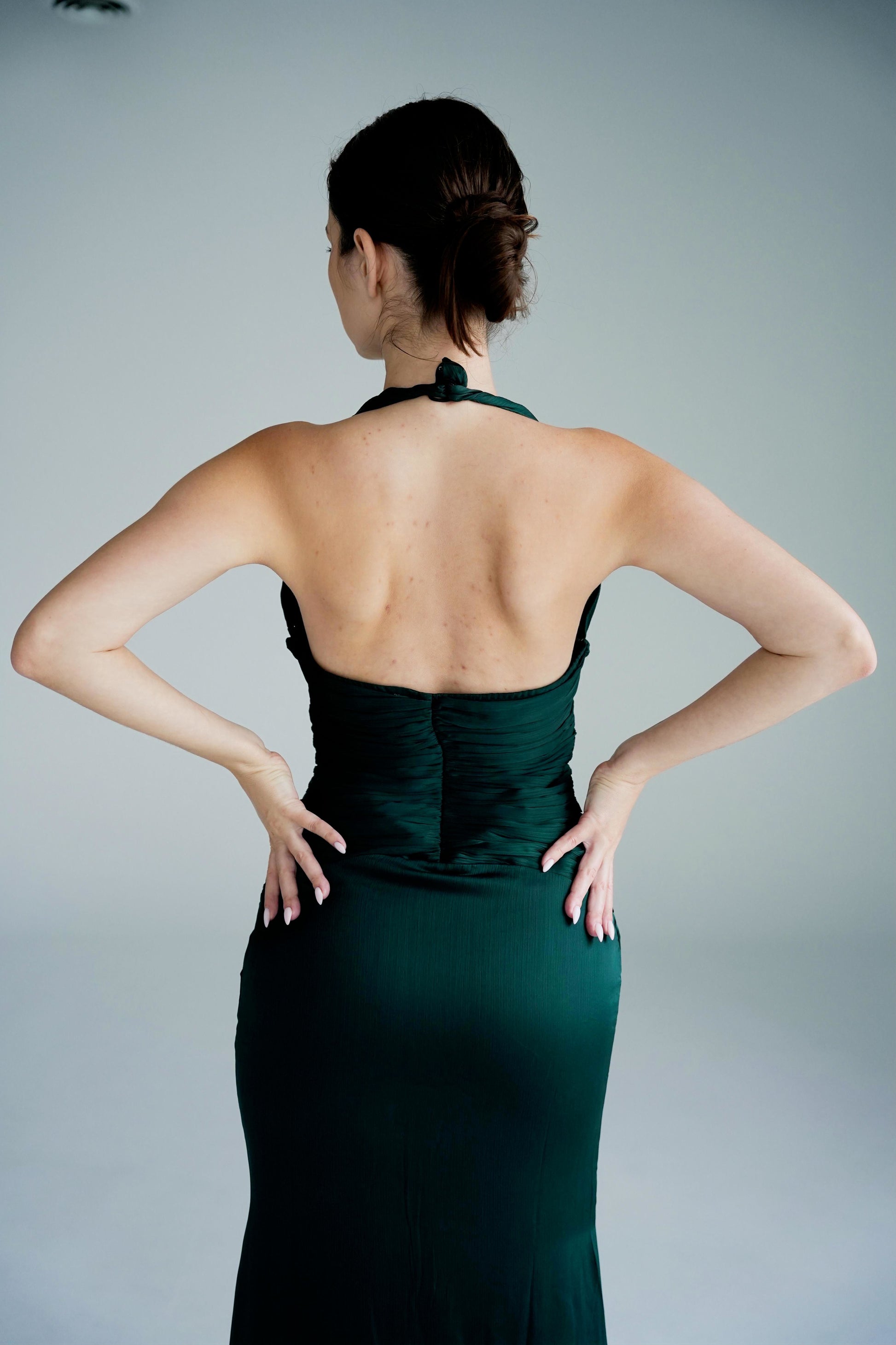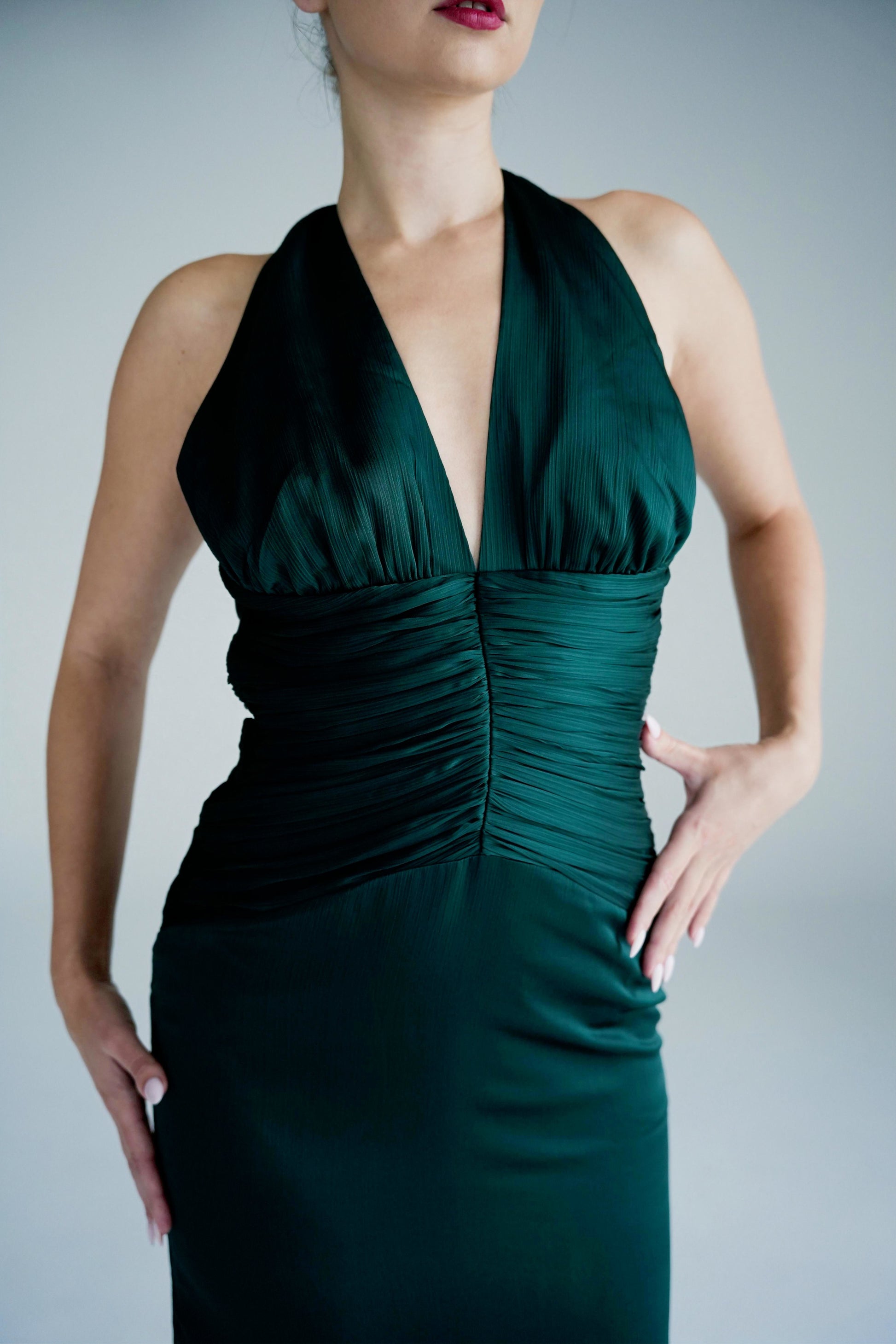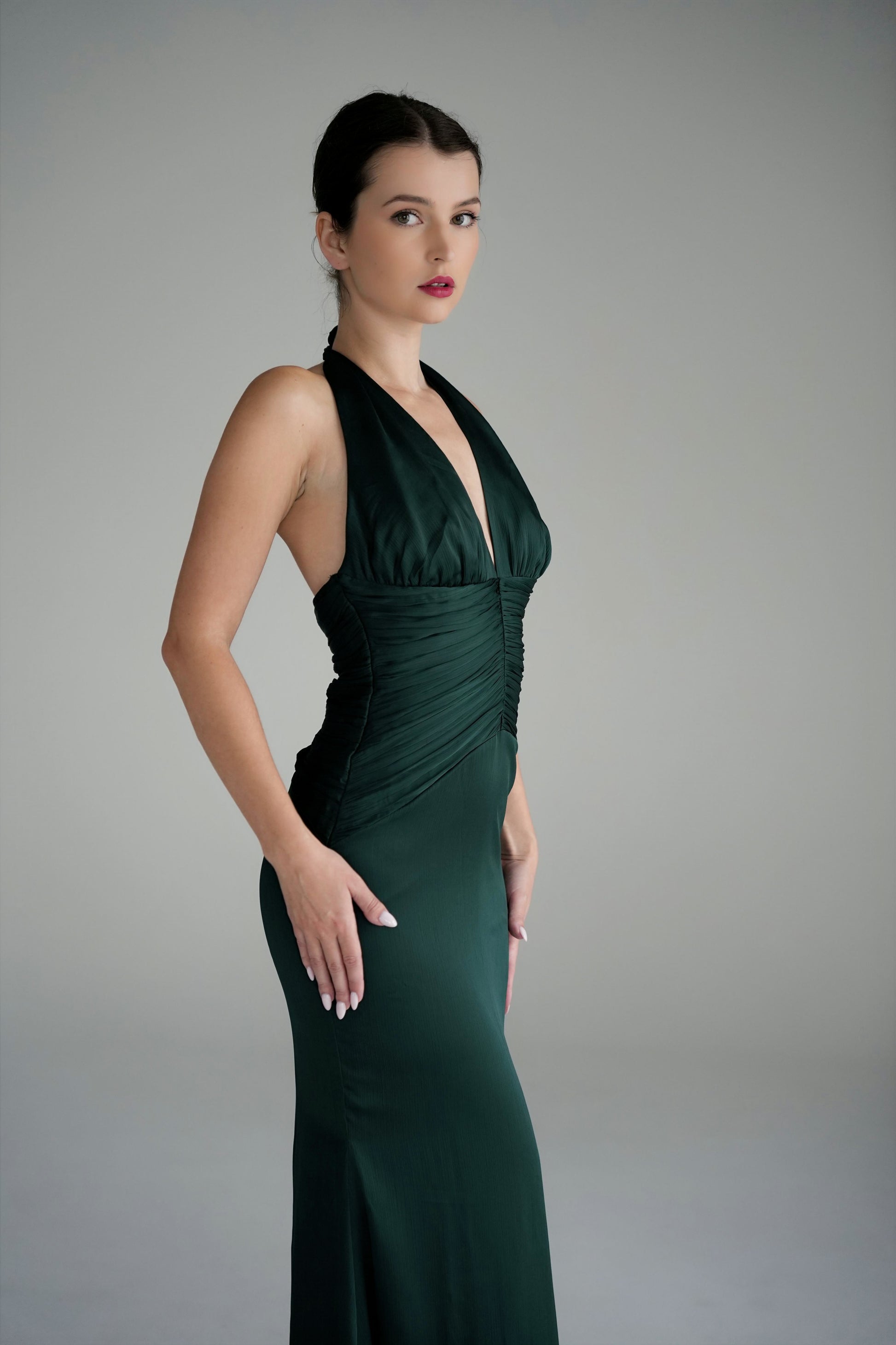 This breathtaking masterpiece features a daring deep V-neckline in luxurious pleated green chiffon that flows seamlessly into elegant rib draping from bust to waist. The body-hugging silhouette celebrates every curve before dramatically flaring into a stunning mermaid trail that commands attention with every step. Strategic pleating throughout creates texture and movement – because confidence deserves to make an entrance.