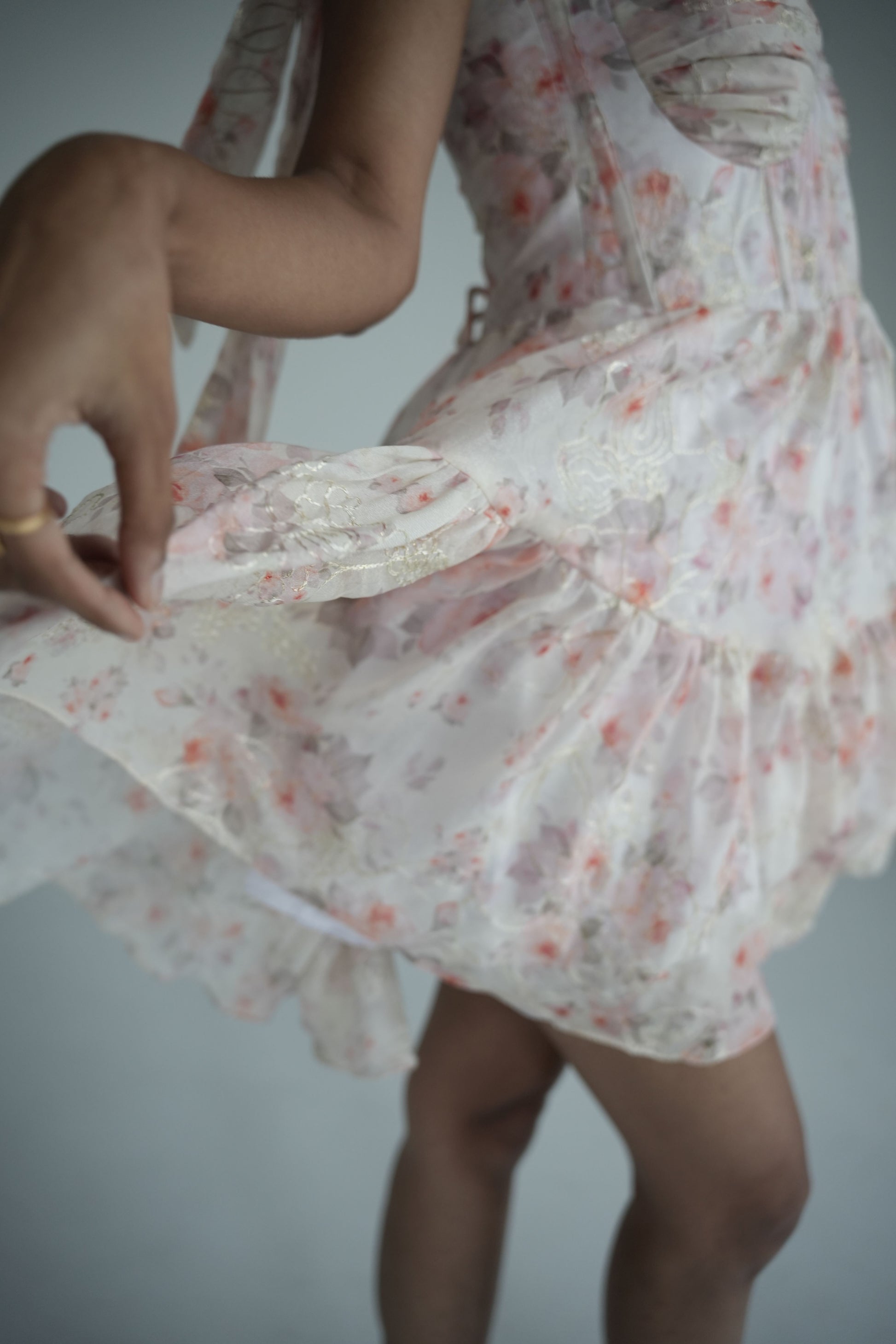 This free-spirited beauty features a confidence-boosting corset that hugs you in all the right places, while the playful tiered ruffles dance with every move you make. The delicate floral embroidery whispers summer secrets across buttery-soft chiffon – because life's too short for boring clothes.