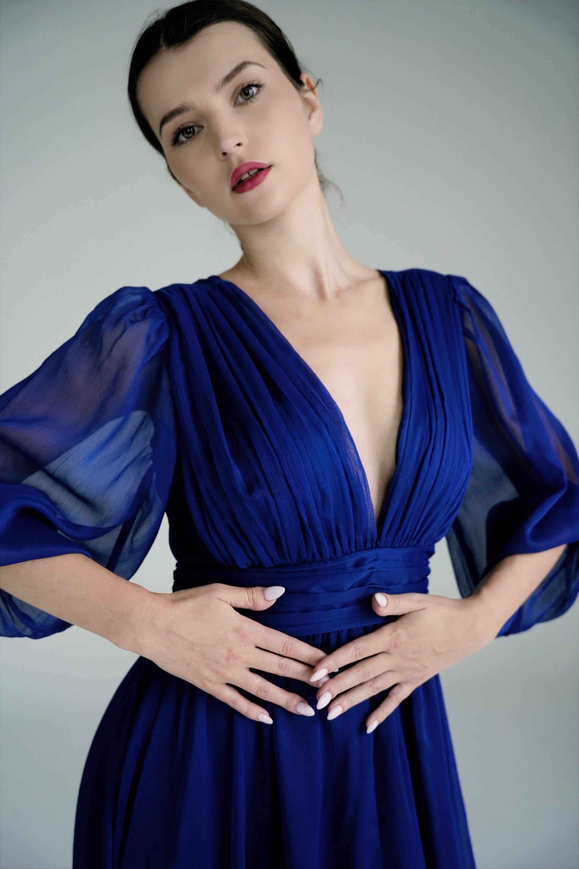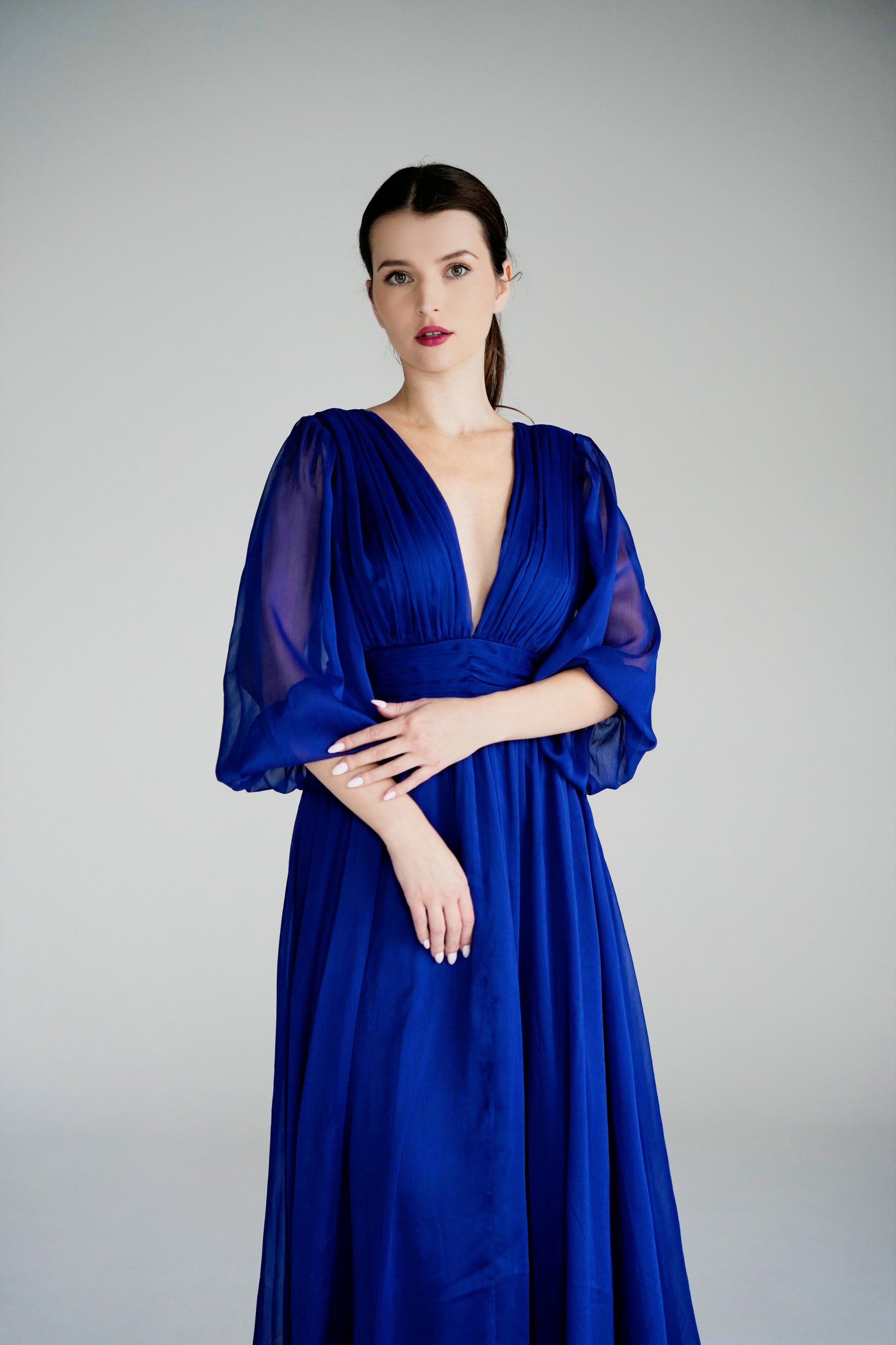 This enchanting beauty features a dramatic deep V-neckline with draped cups that celebrate your silhouette, while the empire waist creates that flattering high-waisted elegance. The show-stopping balloon sleeves with fitted elastic cuffs add vintage-inspired drama, flowing into a graceful A-line maxi that moves like poetry with every step.