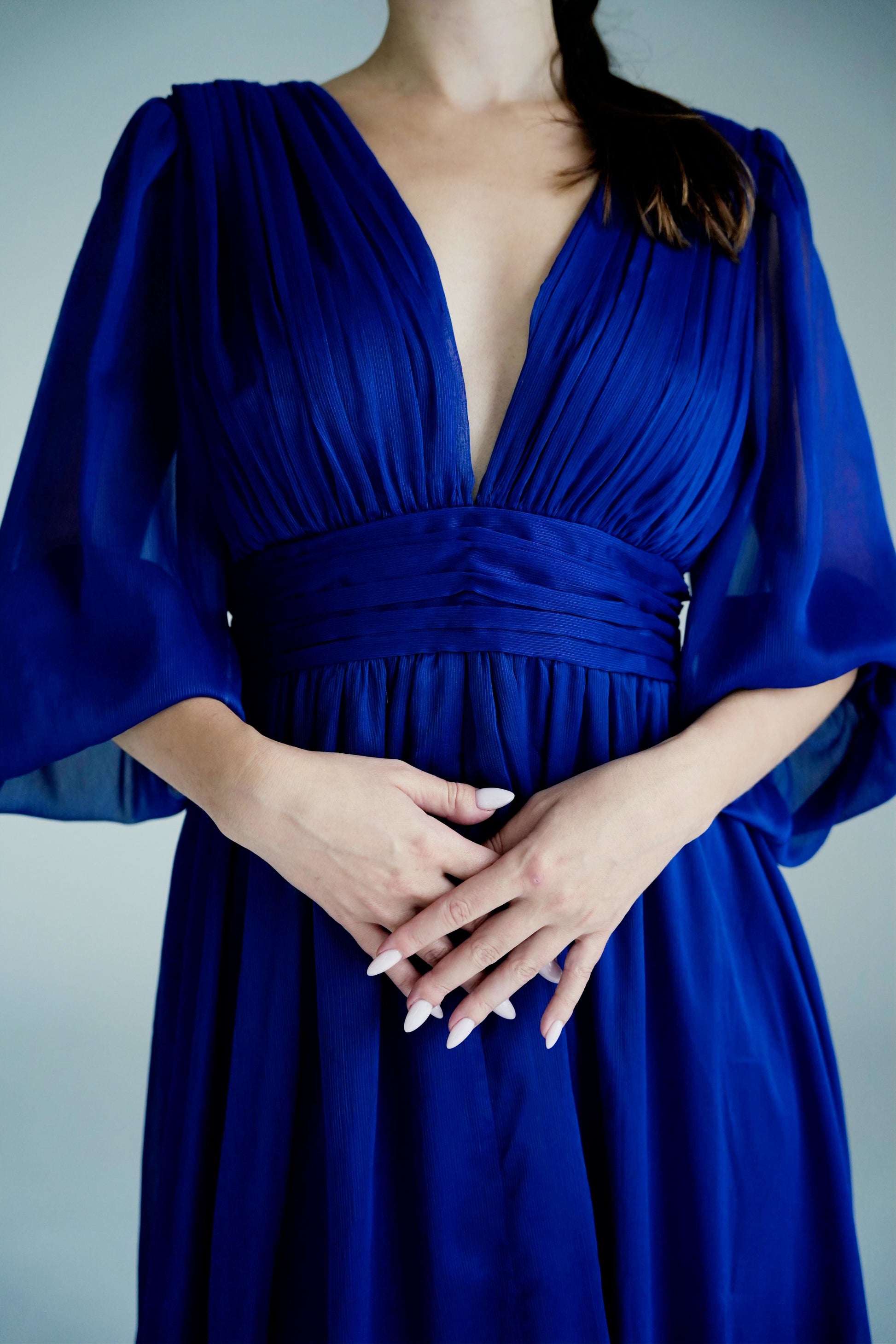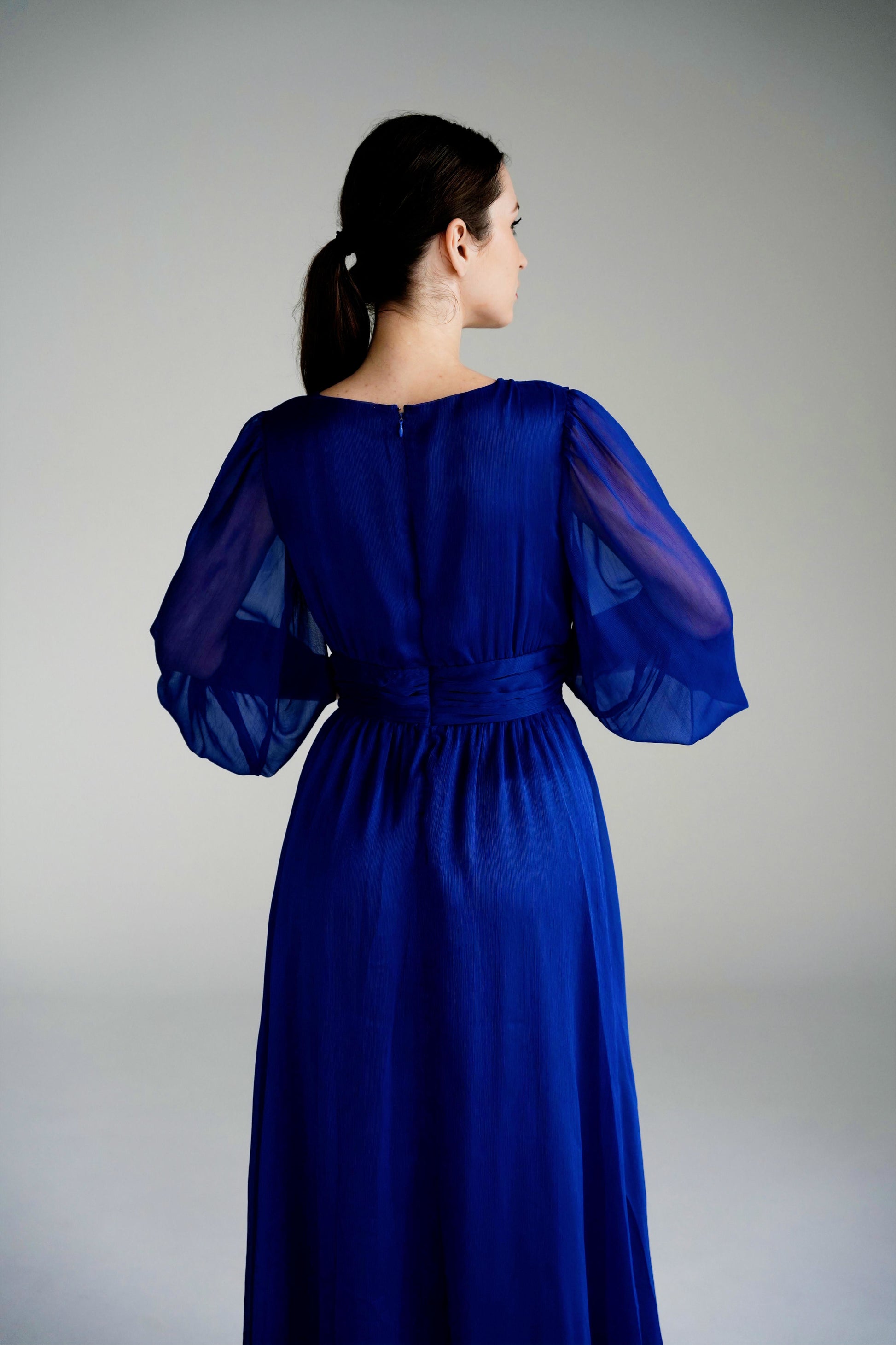 This style features premium blue chiffon with premium lining and empire waist construction. The balloon sleeves with elastic cuffs and back zip closure ensure the perfect fit.