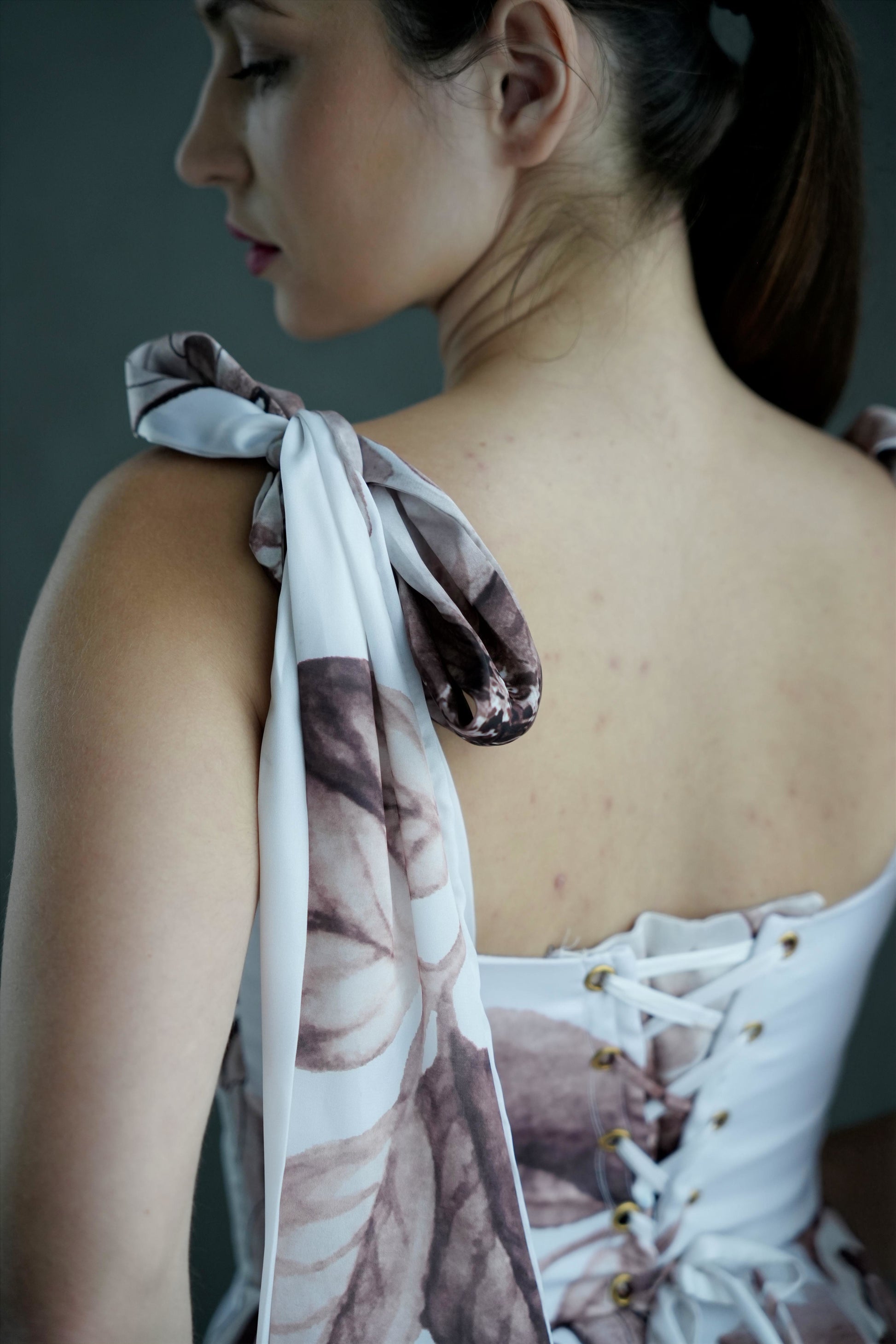 This show-stopping beauty features our signature corset construction with a dramatic sweetheart neckline that celebrates your curves, while romantic bow-tie straps frame your shoulders perfectly. The oversized floral blooms dance across luxe satin georgette – because subtle was never in your vocabulary.
