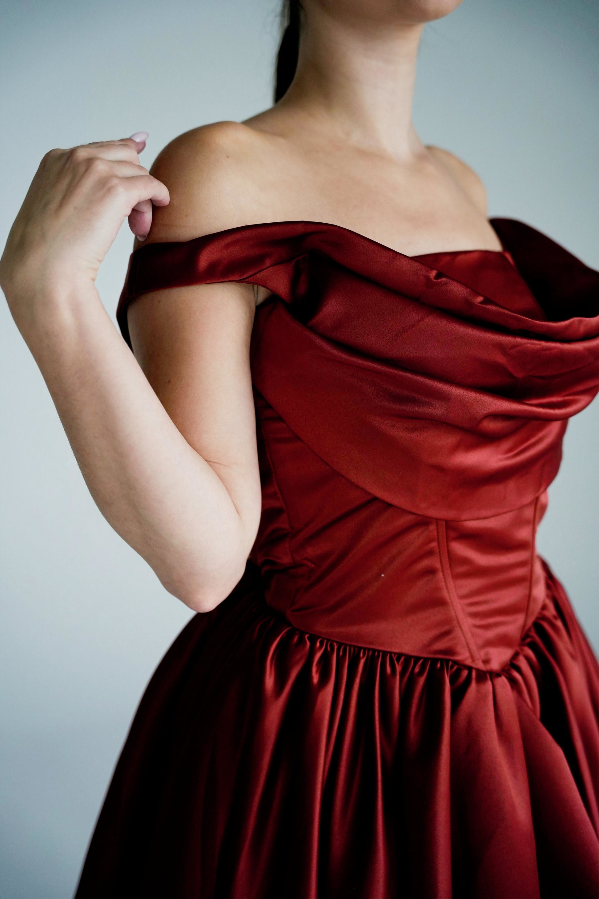 This style features premium matt satin with tulle lining and boned bodice construction for structure and support. The T-shaped waist creates a flattering silhouette.