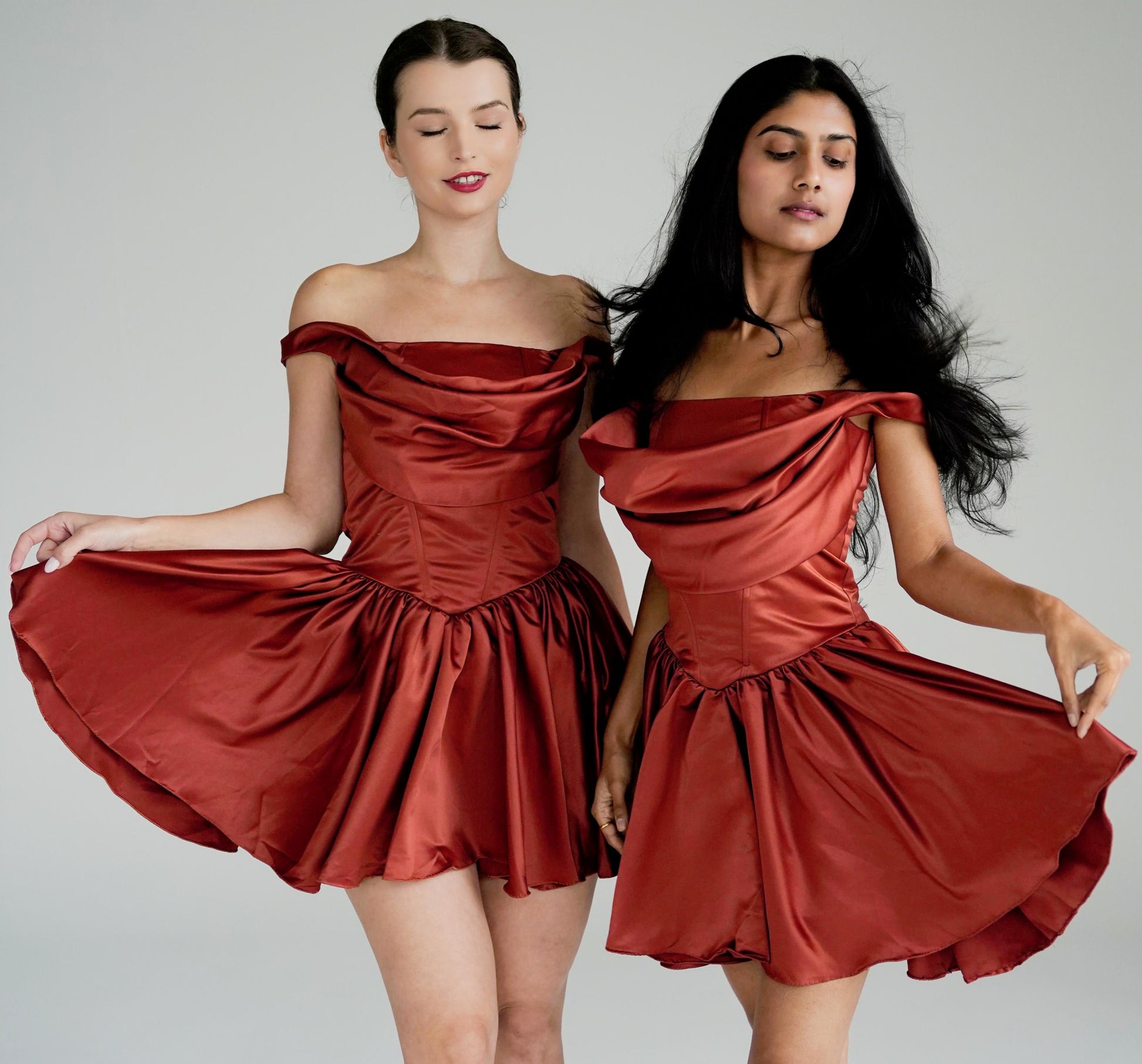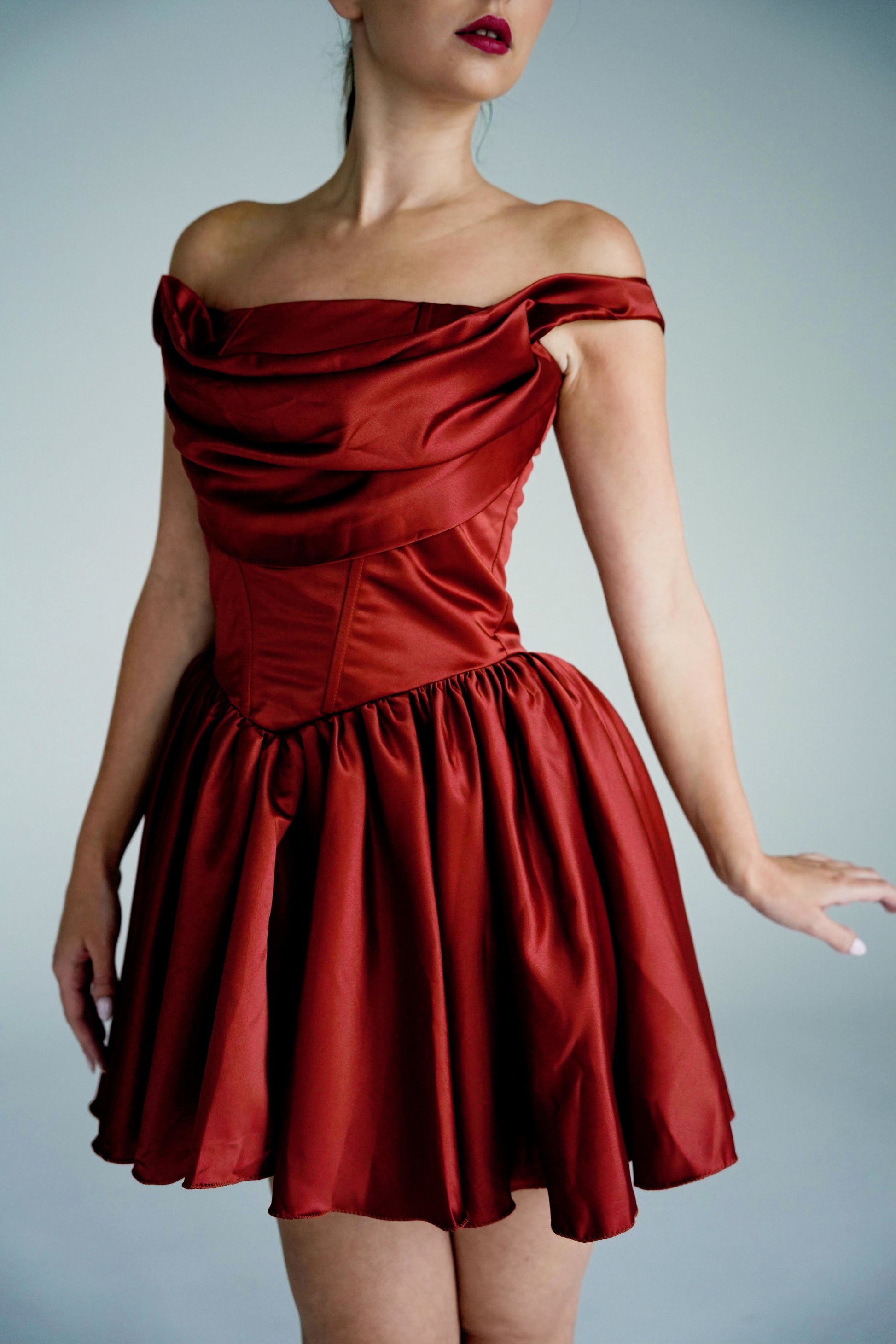 This luxe masterpiece features our signature boned bodice construction with a stunning draped cowl neckline that flatters every curve, while the structured T-shaped waist creates that perfect hourglass silhouette. The rich burnt orange hue radiates warmth and sophistication – because you deserve to be the center of attention.