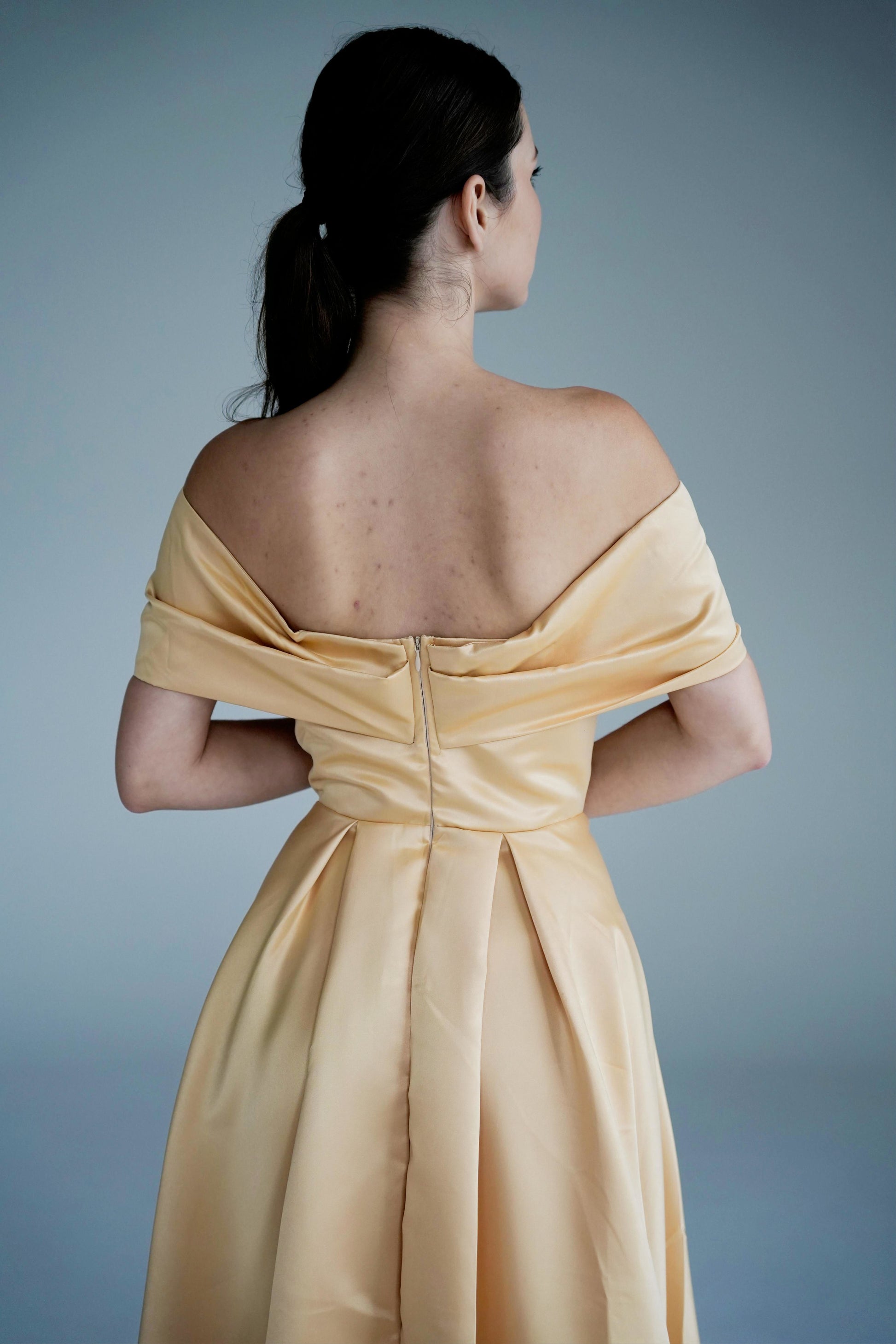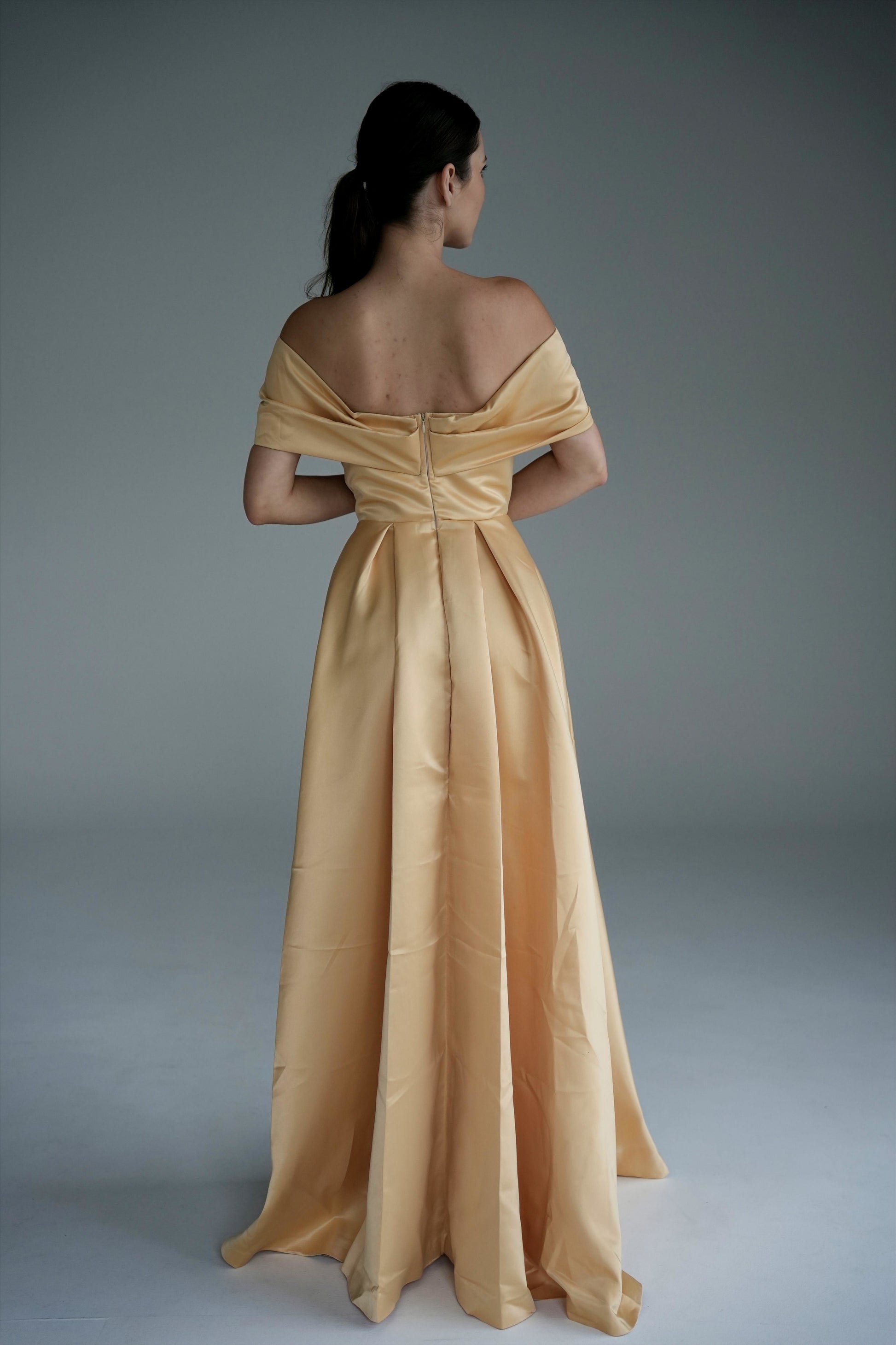 This breathtaking beauty features a romantic sweetheart neckline with sophisticated off-shoulder detailing that frames your décolletage perfectly. The fitted bodice is expertly pleated to sculpt your silhouette, while the flowing maxi skirt cascades like molten gold with every step. Strategic pleating throughout creates dimension and movement – because true elegance is in the details.