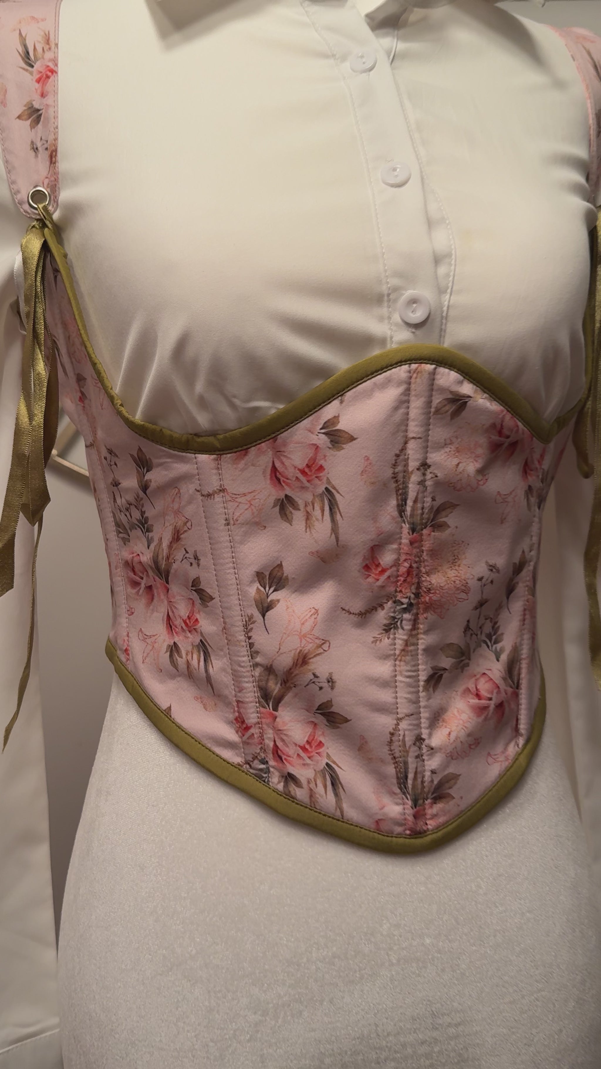 This enchanting underbust corset features romantic floral embroidery that blooms across the bodice in soft pink and green tones. The metal boning celebrates your curves while adjustable ribbon ties create a custom fit. The structured design sits beautifully under the bust, making it perfect for layering over blouses or wearing as a statement piece.